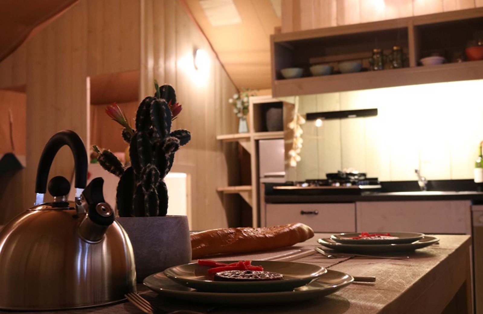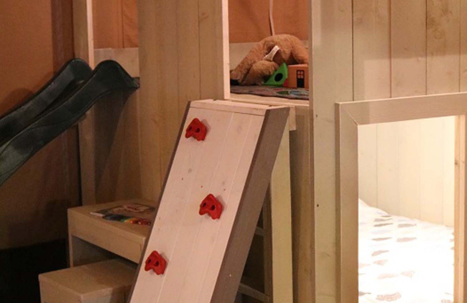 Via een klimwandje het bed in en via de glijbaan eruit? De Glampinglodge voor 7 personen is een echte droomaccommodatie voor kinderen. Daarnaast is deze luxe Glampinglodge luxe ingericht met o.a. een eigen badkamer en volledig uitgeruste keuken mét vaatwasser!