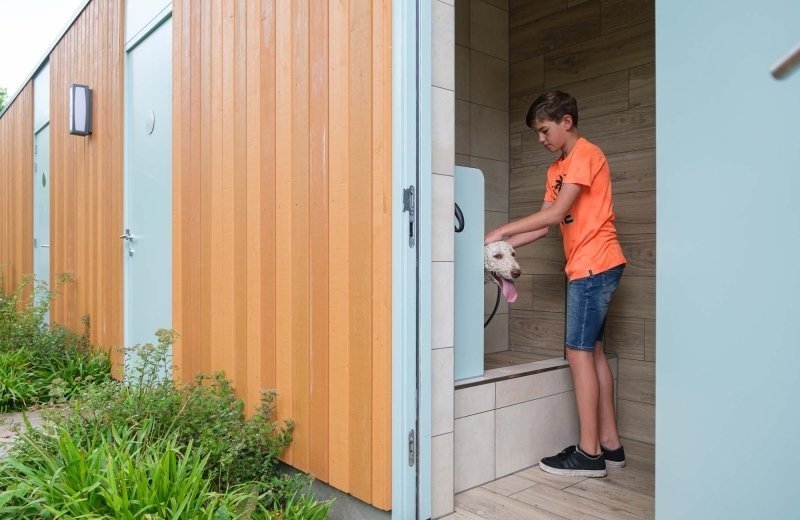 Na het spelen en ravotten kan in het hondenuitlaatveld van de camping in Overijssel met hond, kan uw hond ook onder de douche gedaan worden. In het sanitair gebouw is een heuse hondendouche, waar u de hond kunt wassen en/of schoonspoelen.
