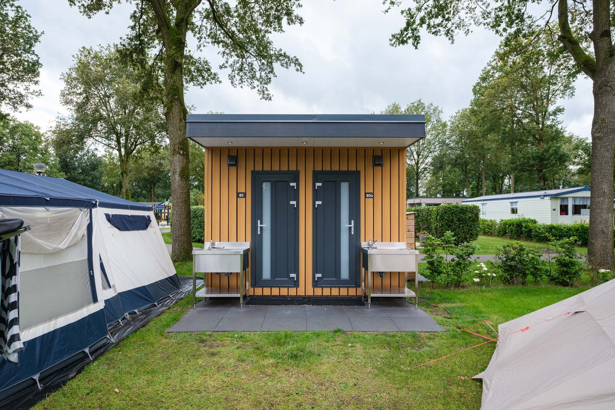 Bij ons luxe privé sanitair beschikt u naast een badkamer met douche en toilet ook over een vaatwasser en koelkast met vriesvak op uw eigen kampeerplaats. Wanneer u kiest voor een privé badkamer in het sanitairgebouw kunt u met uw kampeermiddel terecht op iedere kampeerplek naar keuze.