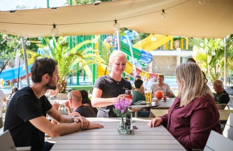 Voor het Grand Café ligt een groot terras met ruim 100 zitplaatsen, wat uitkijkt over de grote nieuwe speeltuin, zwembad en binnenspeeltuin. In de zomermaanden is het terras overdekt en voorzien van gezellige verlichting. In het Grand Café kunnen ook een 125 gasten zitten en wordt er ook in de snackbar veel afgehaald. Kortom een levendige plek, waar mensen graag vertoeven.
